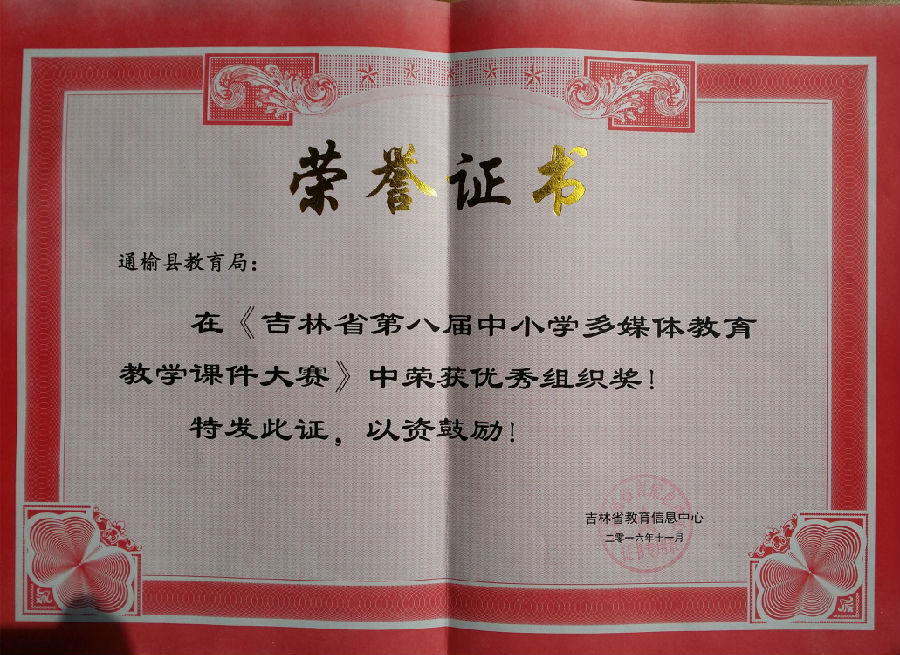 通榆县教育局荣获吉林省第八届中小学多媒体教育教学课件大赛优秀组织奖